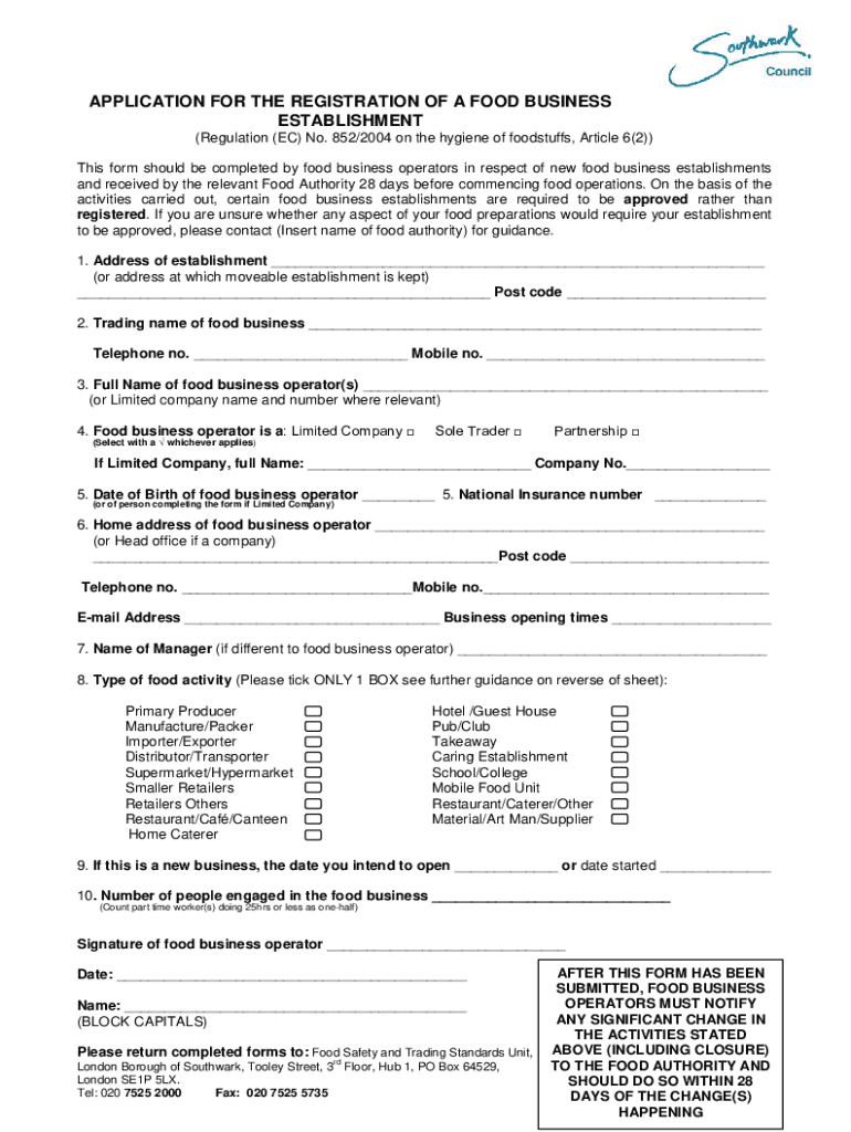APPLICATION FOR THE REGISTRATION OF A FOOD BUSINESS ESTABLISHMENT (Regulation (EC) No. 852/2004 on the hygiene of foodstuffs, Article 6(2)) This form should be completed by food business operators