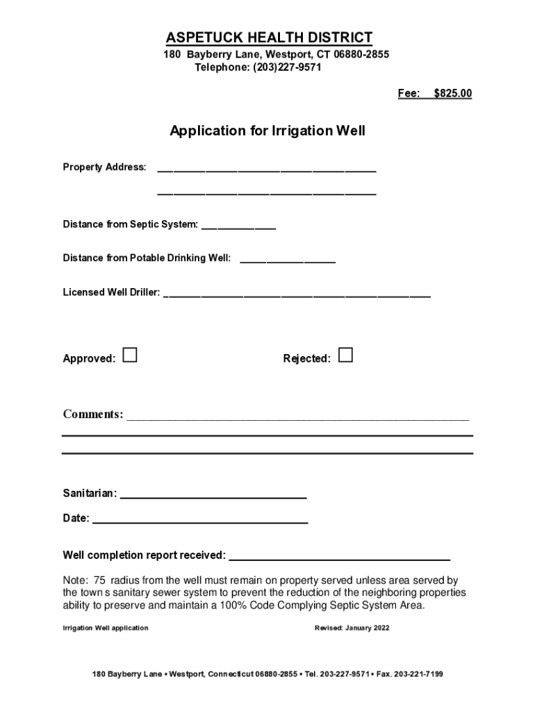 ASPECT HEALTH DISTRICT180 Bayberry Lane, Westport, CT 068802855 Telephone: (203)2279571 Fee:$825.00Application for Irrigation Well Property Address:___ ___Distance from Septic System: ___ Distance