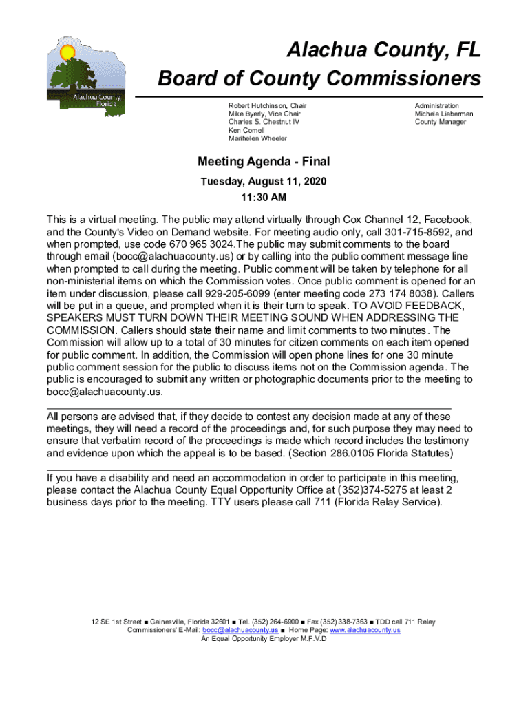 Alachua County, FL Board of County Commissioners Robert Hutchinson, Chair Mike Barely, Vice Chair Charles S. Chestnut IV Ken Cornell Marilyn WheelerAdministration Michele Lieberman County ManagerMeeting