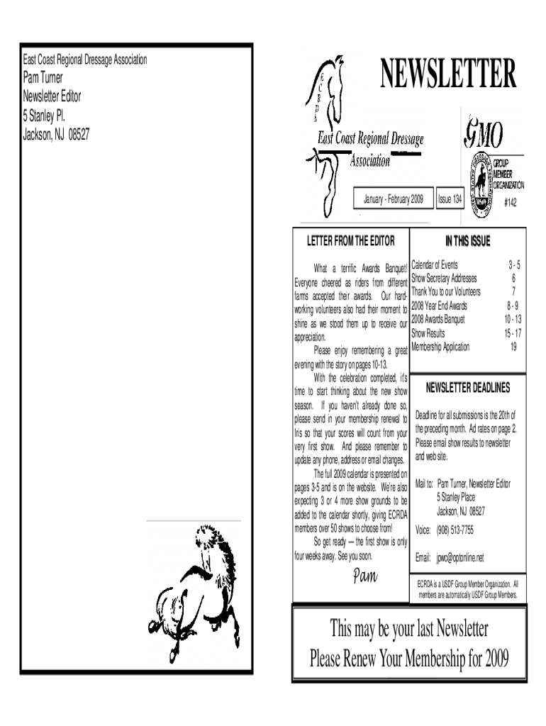 East Coast Regional Dressage AssociationNEWSLETTERPam Turner Newsletter Editor 5 Stanley Pl. Jackson, NJ 08527January February 2009Issue 134LETTER FROM THE EDITOR#142IN THIS ISSUE Calendar of Events