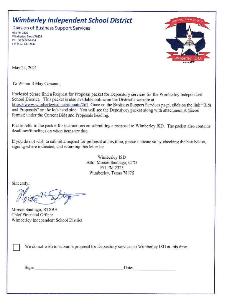 Bid Notice for Depository Services by Kimberley Independent School District 951 FM 2325 Kimberley, TX 78676Wimberley Independent School District is soliciting bids from banks to serve as a depository