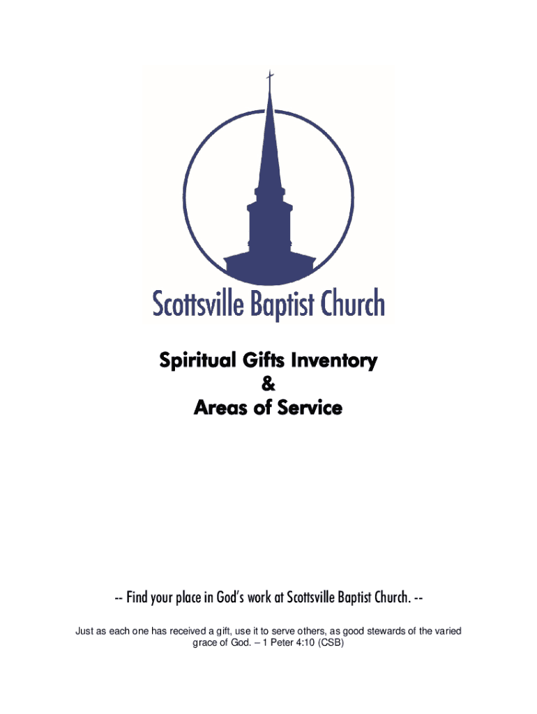 Spiritual Gifts Inventory & Areas of Service Find your place in Gods work at Pottsville Baptist Church. Just as each one has received a gift, use it to serve others, as good stewards of the varied