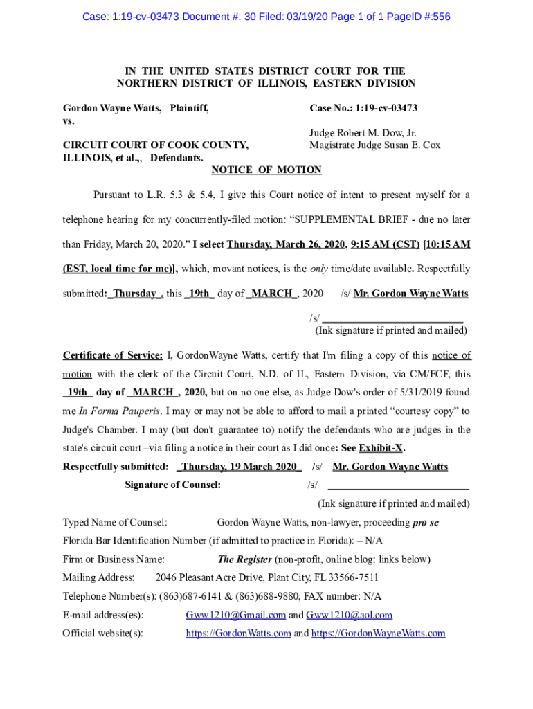 Case: 1:19cv03473 Document #: 30 Filed: 03/19/20-Page 1 of 1 Paged #:556IN THE UNITED STATES DISTRICT COURT FOR THE NORTHERN DISTRICT OF ILLINOIS, EASTERN DIVISION Gordon Wayne Watts, Plaintiff, vs.