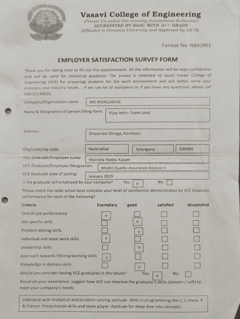 COLVasavi College of Engineering (Private Unaided Nonminority Autonomous Institution) ACCREDITED BY NAACP WITH A++\' GRADEAfiliated to Os mania University and Approved by AICTEFormat No. NBA/001EMPLOYER