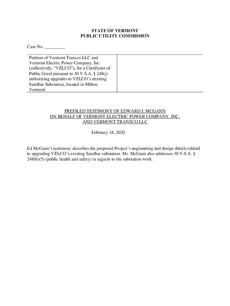 STATE OF VERMONT PUBLIC UTILITY COMMISSION Case No. ___ Petition of Vermont Transco LLC and Vermont Electric Power Company, Inc. (collectively, VELCRO), for a Certificate of Public Good pursuant to