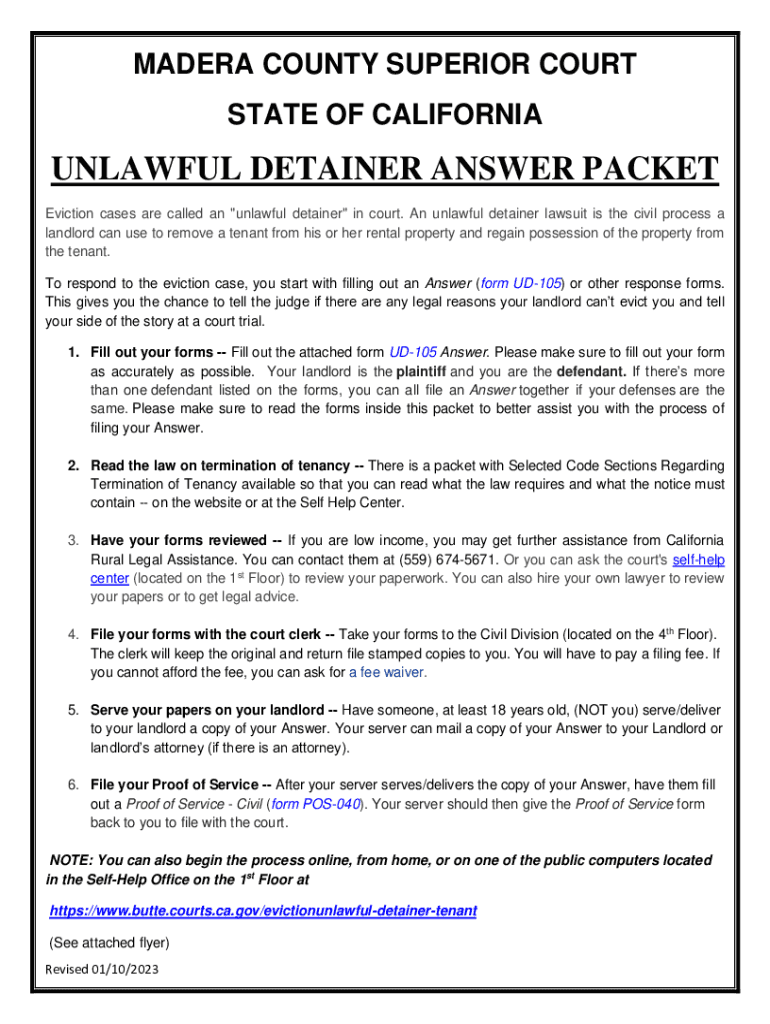 MADERA COUNTY SUPERIOR COURT STATE OF CALIFORNIAUNLAWFUL DETAINED ANSWER PACKET Eviction cases are called an \” unlawful detained\” in court. An unlawful detained lawsuit is the civil process