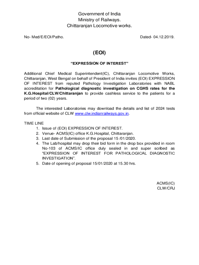 Government of India Ministry of Railways. Chittaranjan Locomotive works. No Med/E/EOI/Path. Dated 04.12.2019.(EOI) EXPRESSION OF INTEREST Additional Chief Medical Superintendent(IC), Chittaranjan