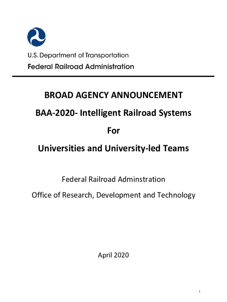 BROAD AGENCY ANNOUNCEMENT BAA2020 Intelligent Railroad Systems For Universities and University led Teams Federal Railroad Administration Office of Research, Development and Technology April 2020iContents