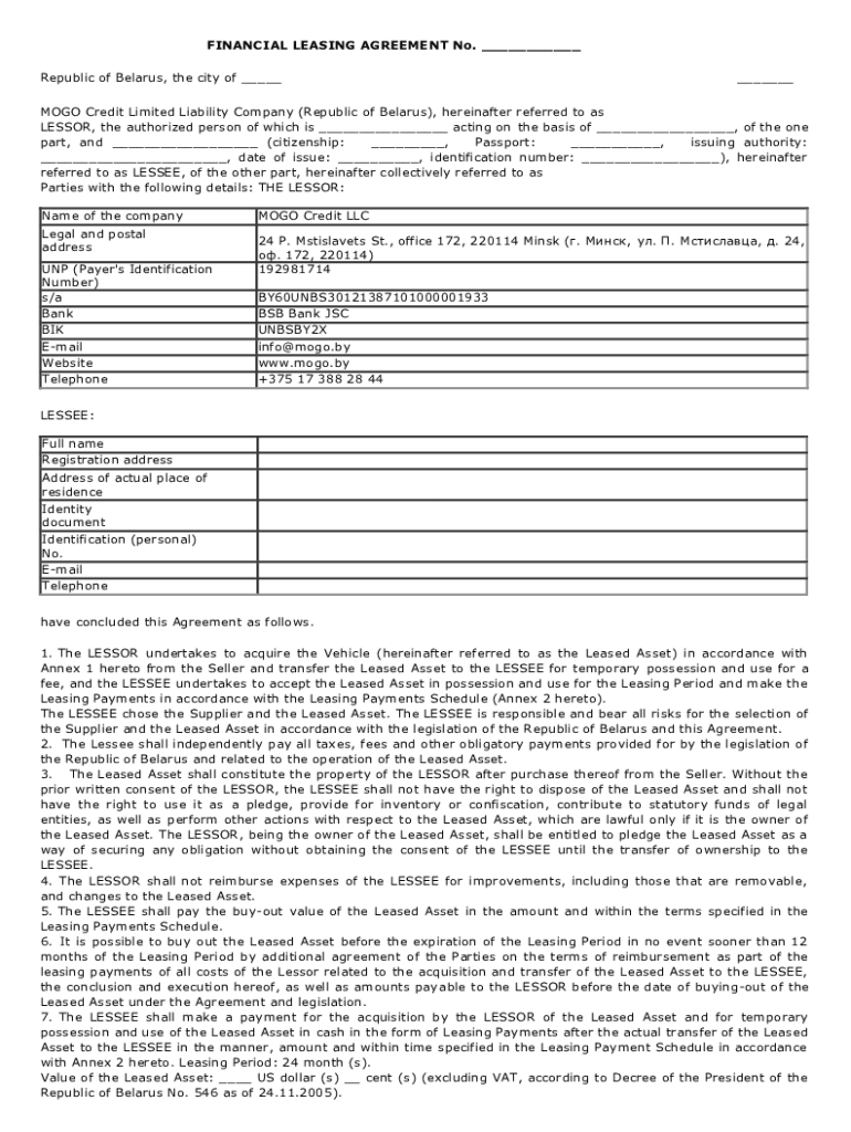 FINANCIAL LEASING AGREEMENT No. ___ Republic of Belarus, the city of ______LOGO Credit Limited Liability Company (Republic of Belarus), hereinafter referred to as LESSOR, the authorized person of