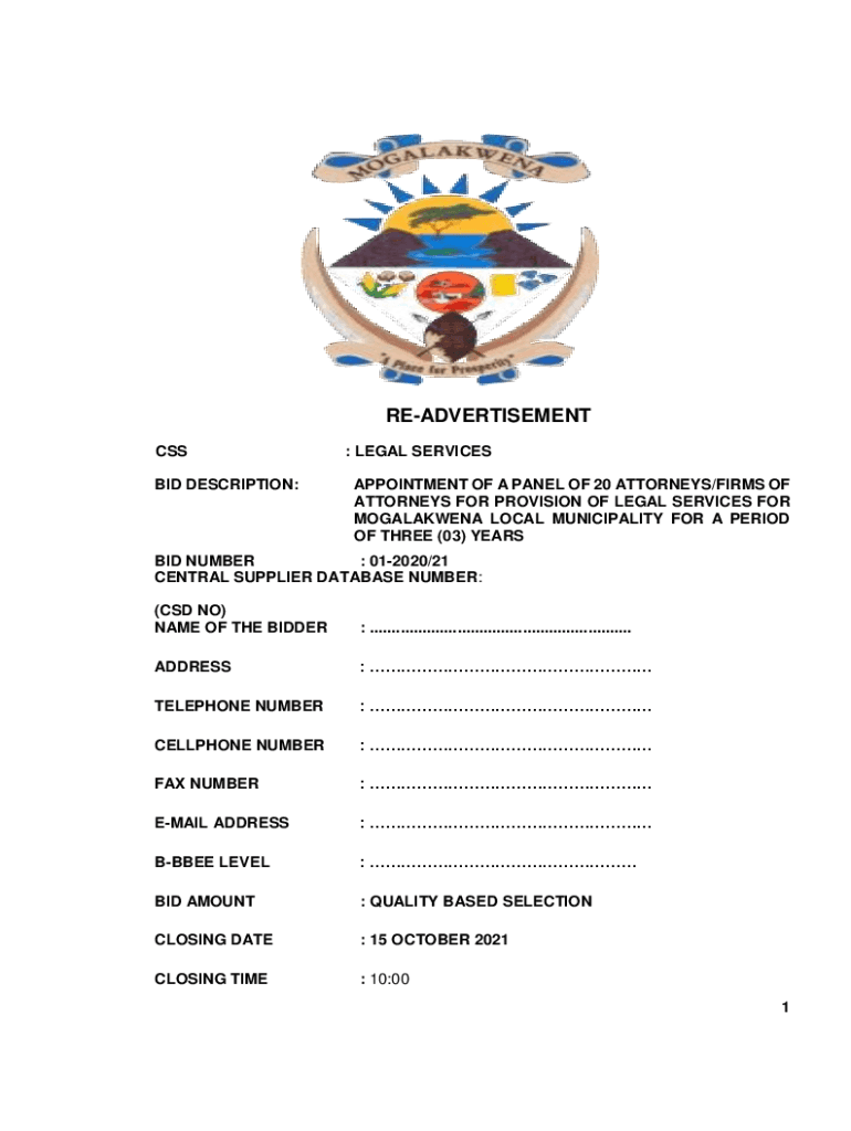 ADVERTISEMENT CSS BID DESCRIPTION:: LEGAL SERVICES APPOINTMENT OF A PANEL OF 20 ATTORNEYS/FIRMS OF ATTORNEYS FOR PROVISION OF LEGAL SERVICES FOR MOGALAKWENA LOCAL MUNICIPALITY FOR A PERIOD OF THREE