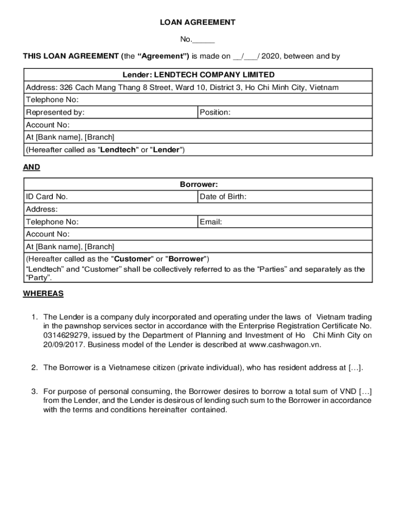 LOAN AGREEMENT No.___ THIS LOAN AGREEMENT (the Agreement) is made on __/___/ 2020, between and by Lender: EDTECH COMPANY LIMITED Address: 326 Each Many Than 8 Street, Ward 10, District 3, Ho Chi Minh