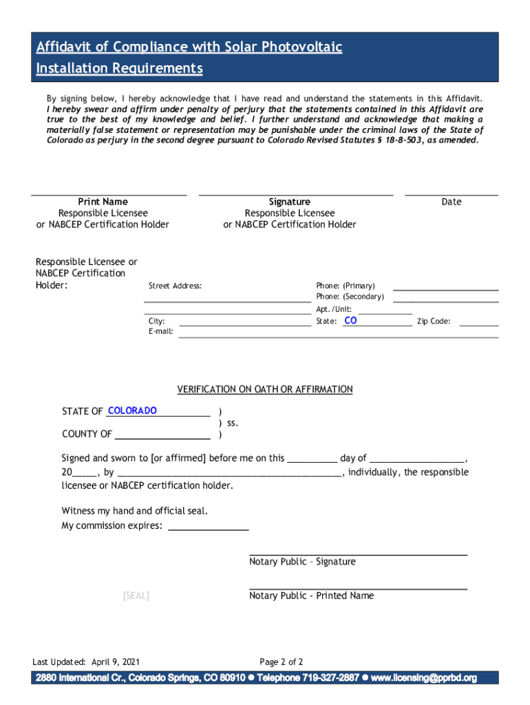 Get the free Affidavit of Compliance with Solar Photovoltaic Installation ...