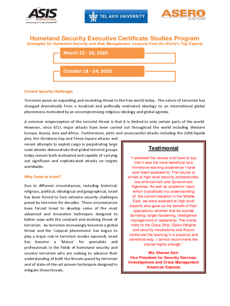 Homeland Security Executive Certificate Studies Program Strategies for Homeland Security and Risk Management: Lessons from the World's Top Experts March 22 28, 2020October 18 24, 2020Current Security
