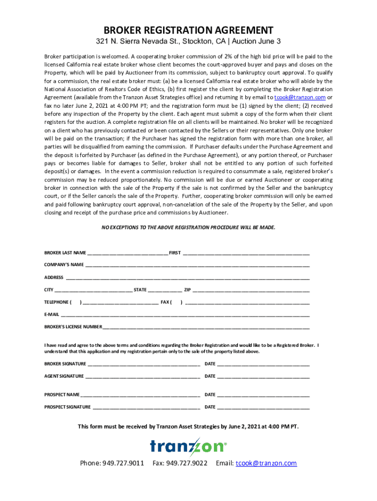 BROKER REGISTRATION AGREEMENT321 N. Sierra Nevada St., Stockton, CA | Auction June 3 Broker participation is welcomed. A cooperating broker commission of 2% of the high bid price will be paid to the