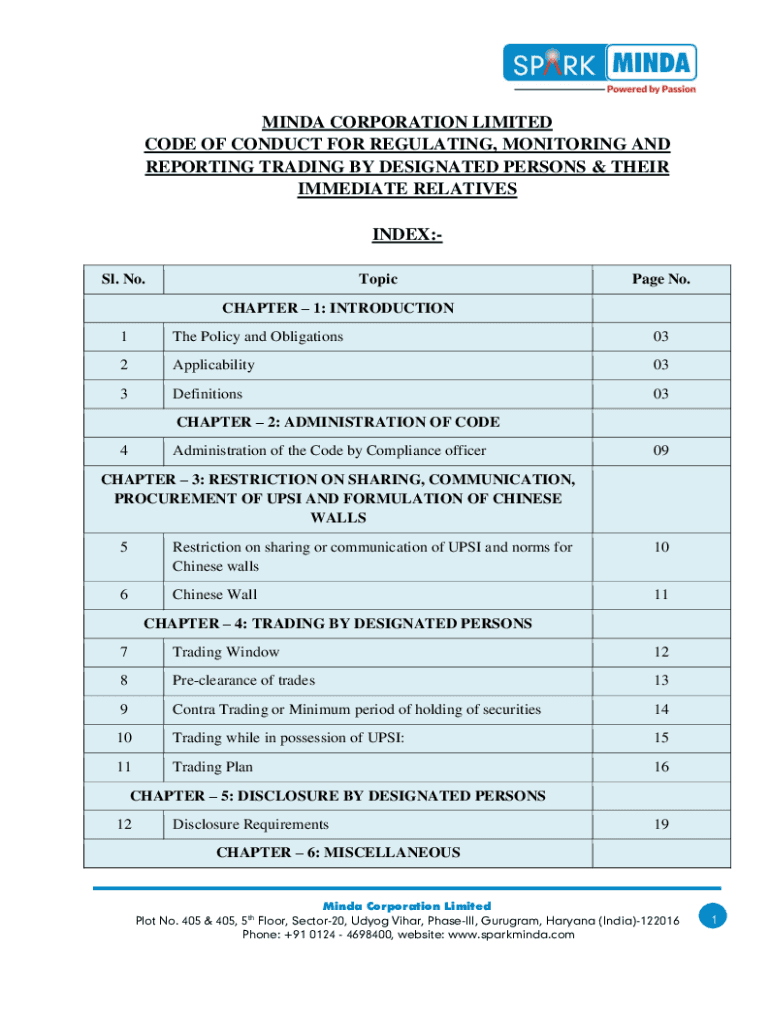 MIND CORPORATION LIMITED CODE OF CONDUCT FOR REGULATING, MONITORING AND REPORTING TRADING BY DESIGNATED PERSONS & THEIR IMMEDIATE RELATIVES INDEX:SL. No. Topic Page No. CHAPTER 1: INTRODUCTION 1The