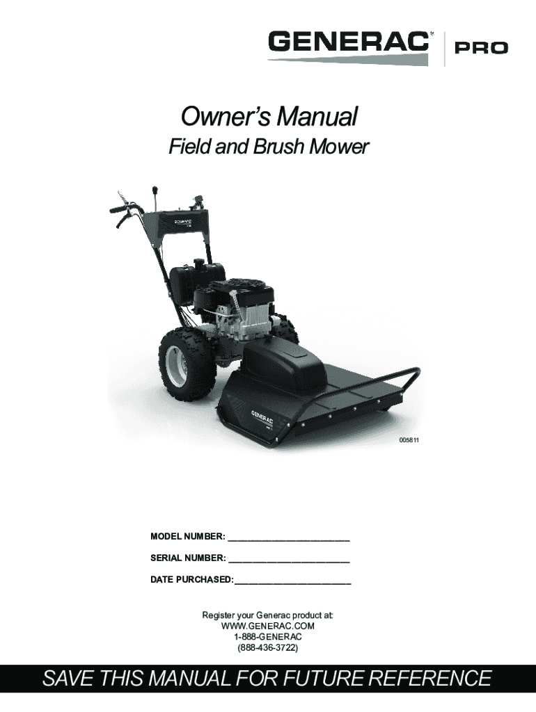 Owners Manual Field and Brush Mower005811MODEL NUMBER: ___ SERIAL NUMBER: ___ DATE PURCHASED:___Register your General product at: WWW.GENERAC.COM 1888GENERAC (8884363722)SAVE THIS MANUAL FOR FUTURE