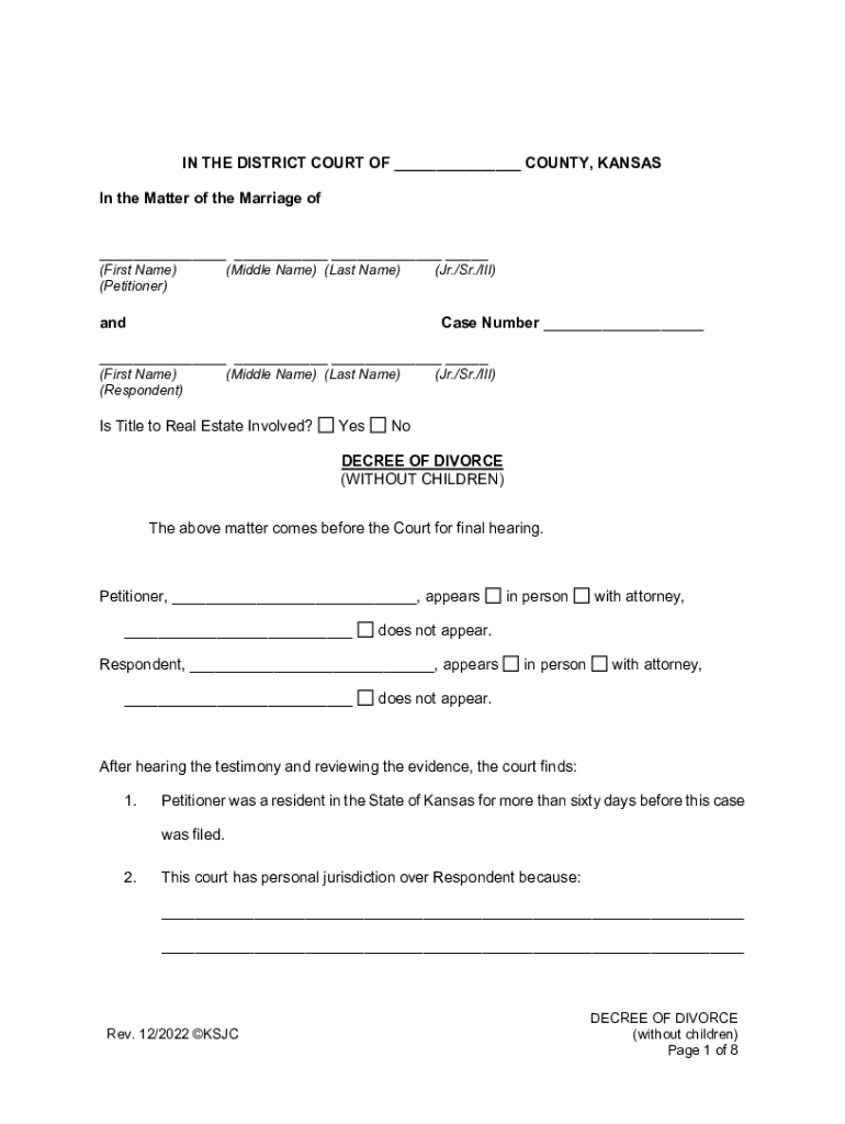 IN THE DISTRICT COURT OF ___ COUNTY, KANSAS In the Matter of the Marriage of ___ ___ ___ ___(First Name) (Petitioner)(Middle Name) (Last Name)and(Jr./Sr./III)Case Number ______ ___ ___ ___ (First
