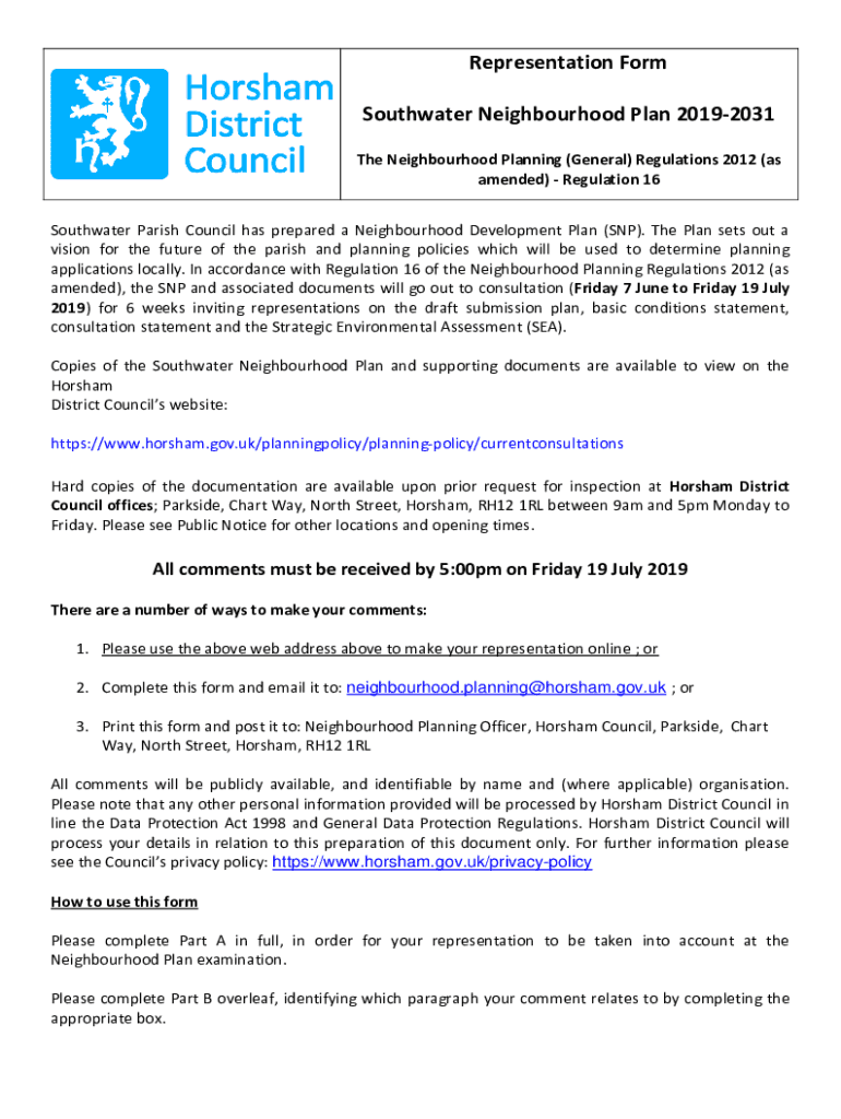 Representation Form South water Neighborhood Plan 20192031 The Neighborhood Planning (General) Regulations 2012 (as amended) Regulation 16 South water Parish Councils has prepared a Neighborhood Development