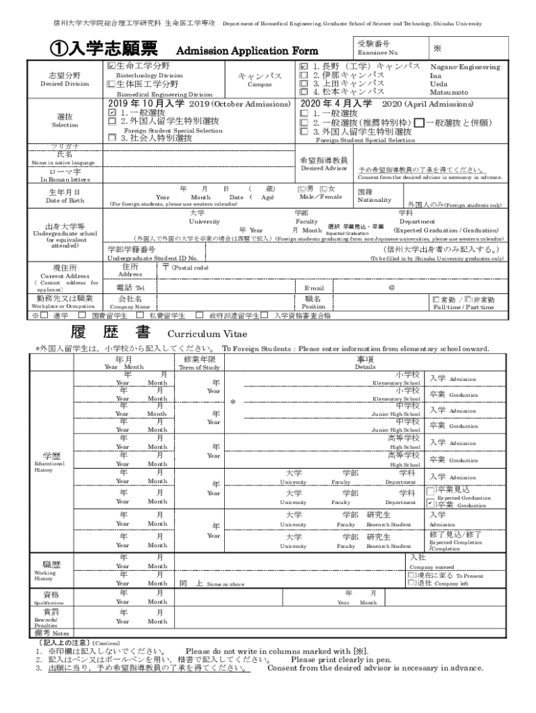 Department of Biomedical Engineering, Graduate School of Science and Technology, Shins UniversityAdmission Application Form