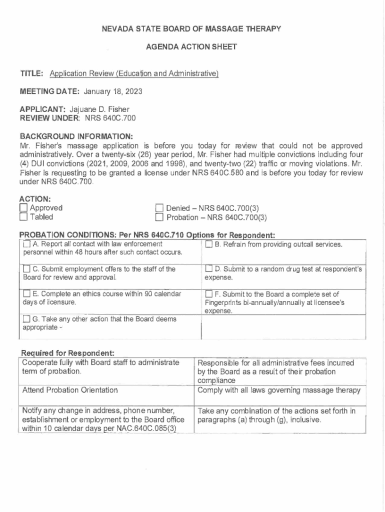 NEVADA STATE BOARD OF MASSAGE THERAPY AGENDA ACTION SHEET TITLE: Application Review (Education and Administrative) MEETING DATE: January 18, 2023, APPLICANT: Jejune D. Fisher REVIEW UNDER: NRS 640C.700