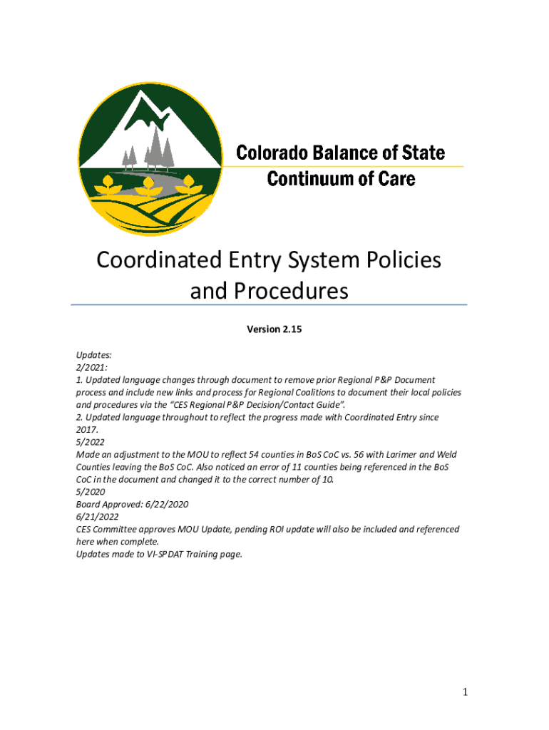Coordinated Entry System Policies and Procedures Version 2.15 Updates: 2/2021: 1. Updated language changes through document to remove prior Regional P&P Document process and include new links and