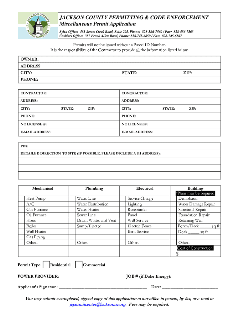 JACKSON COUNTY PERMITTING & CODE ENFORCEMENT Miscellaneous Permit Application Silva Office: 538 Scott's Creek Road, Suite 205, Phone: 8285867560 / Fax: 8285867563 Cashiers Office: 357 Frank Allen