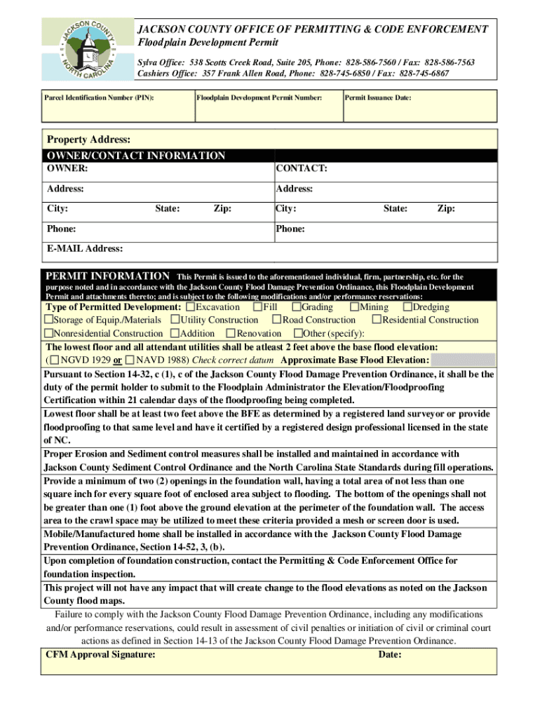JACKSON COUNTY OFFICE OF PERMITTING & CODE ENFORCEMENT Floodplain Development Permit Silva Office: 538 Scott's Creek Road, Suite 205, Phone: 8285867560 / Fax: 8285867563 Cashiers Office: 357 Frank
