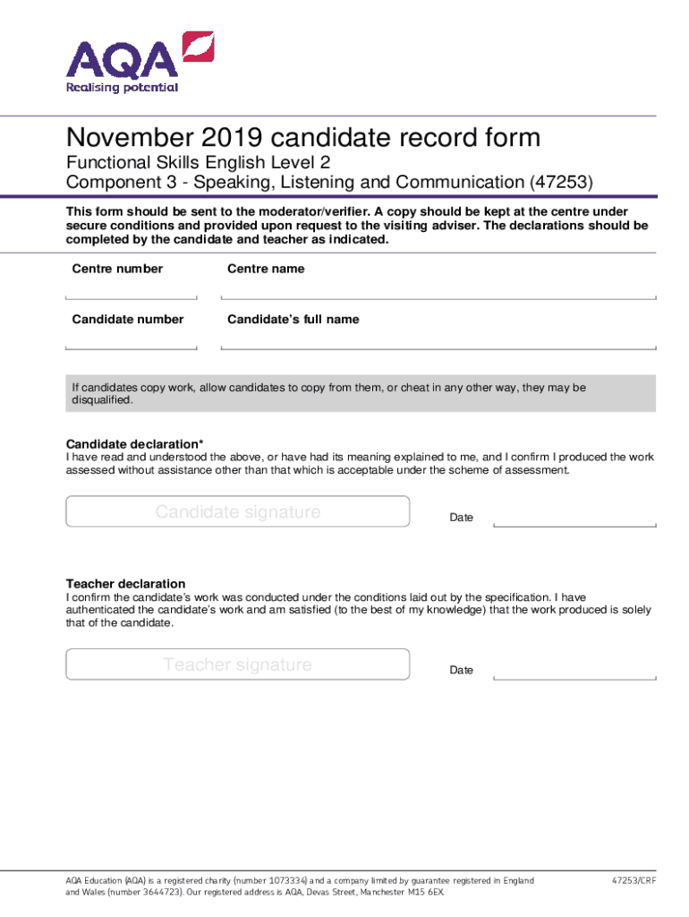November 2019 candidate record form Functional Skills English Level 2 Component 3 Speaking, Listening and Communication (47253) This form should be sent to the moderator/verifier. A copy should be