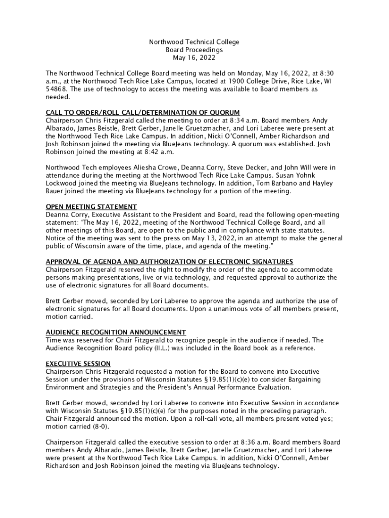 North wood Technical College Board Proceedings May 16, 2022, The North wood Technical College Board meeting was held on Monday, May 16, 2022, at 8:30 a.m., at the North wood Tech Rice Lake Campus,