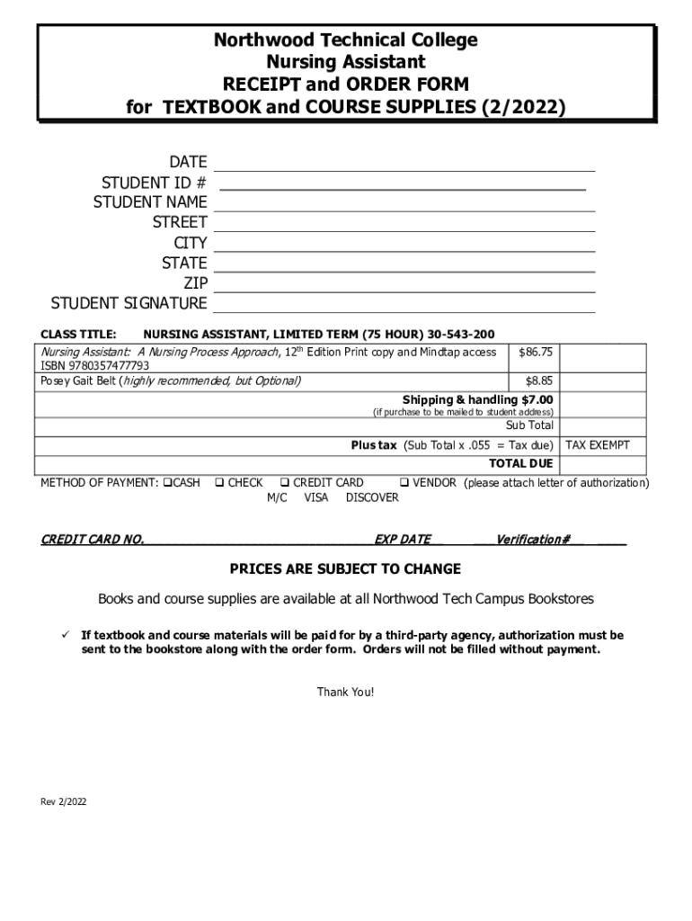 North wood Technical College Nursing Assistant RECEIPT and ORDER FORM for TEXTBOOK and COURSE SUPPLIES (2/2022) DATE STUDENT ID # STUDENT NAME STREET CITY STATE ZIP STUDENT SIGNATURE CLASS TITLE:NURSING