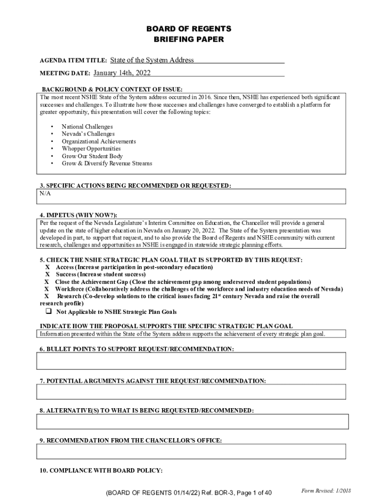 BOARD OF REGENTS BRIEFING PAPER AGENDA ITEM TITLE: MEETING DATE:State of the System Address January 14th, 2022BACKGROUND & POLICY CONTEXT OF ISSUE: The most recent SHE State of the System address