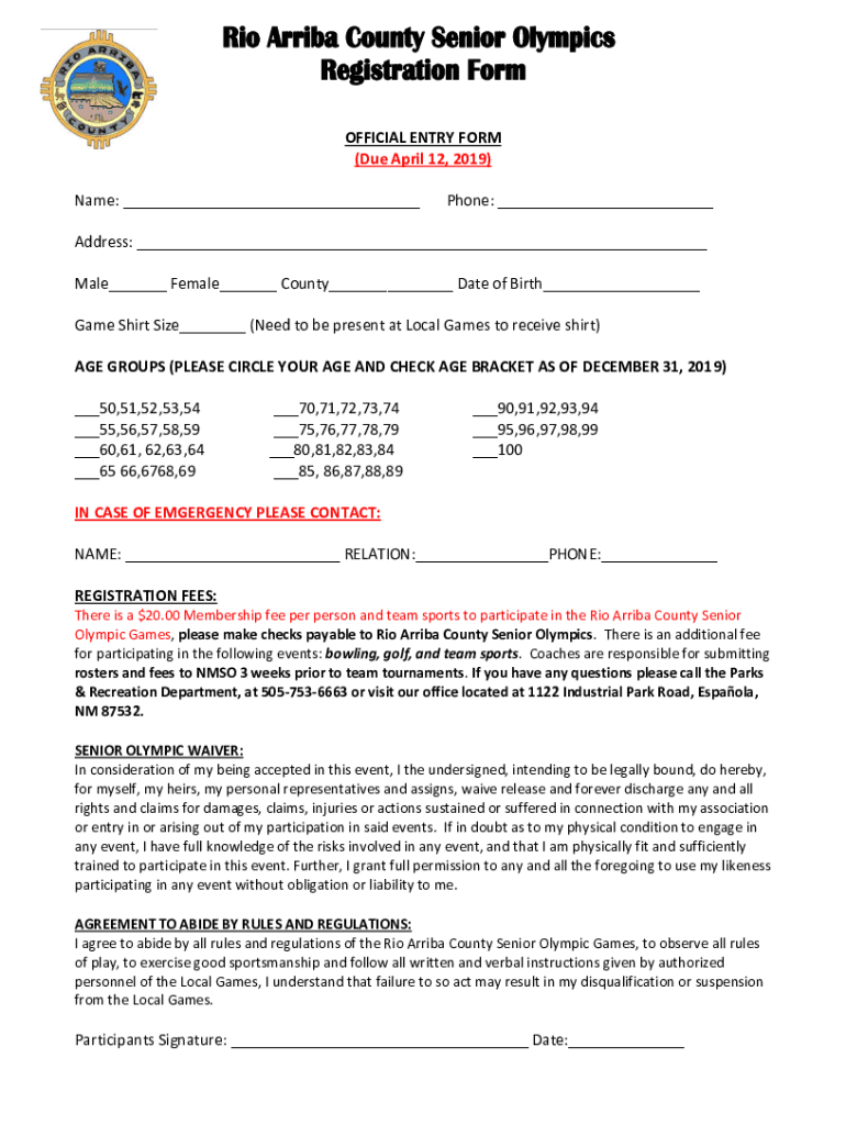 OFFICIAL ENTRY FORM (Due April 12, 2019) Name: ___Phone: ___Address: ___ Male___ Female___ County___ Date of Birth___ Game Shirt Size___ (Need to be present at Local Games to receive shirt) AGE GROUPS