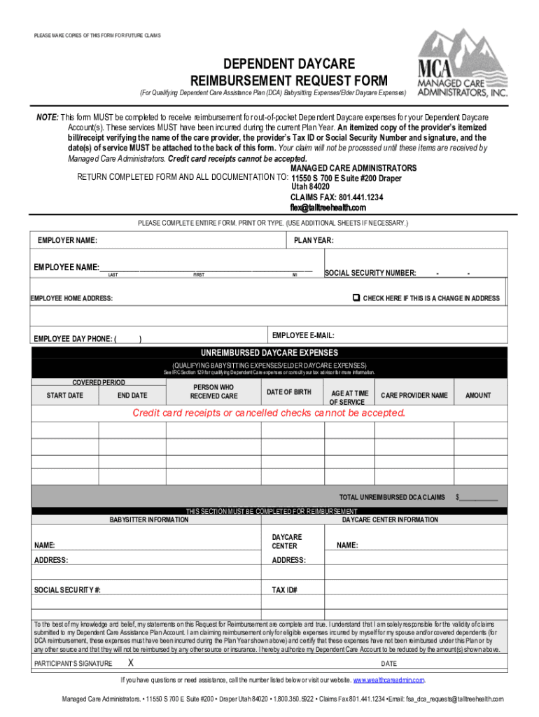 PLEASE MAKE COPIES OF THIS FORM FOR FUTURE CLAIMSDEPENDENT DAYCARE REIMBURSEMENT REQUEST FORM (For Qualifying Dependent Care Assistance Plan (DCA) Babysitting Expenses/Elder Daycare Expenses)NOTE: