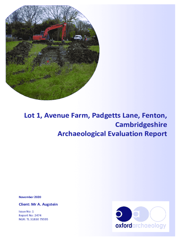 November2020 Client:MRA. Aug stein Issue No:1 Report No:2474 Lot1,AvenueFarm, PadgettsLane, Benton, Cambridge shire ArchaeologicalEvaluationReport NOR:TL3183079595 OxfordArchaeologyLtd27September2021Lot1,AvenueFarm,