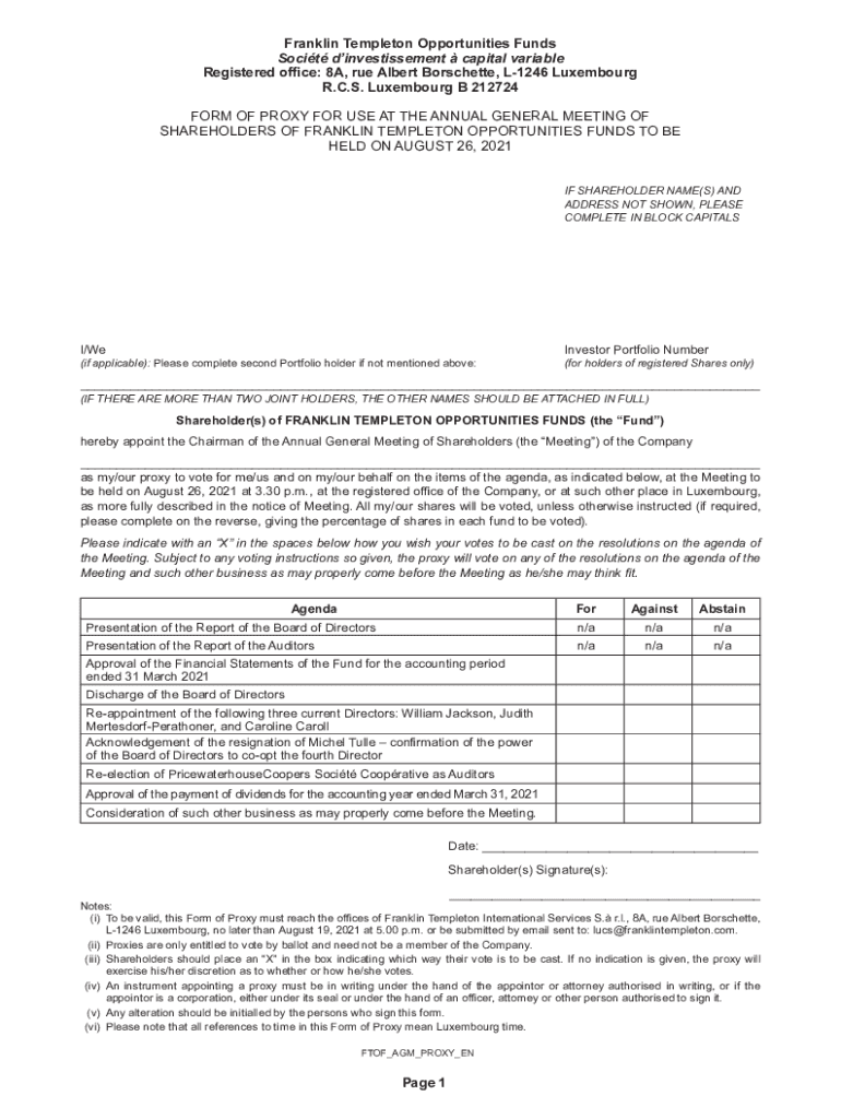 Franklin Templeton Opportunities Funds So cit dinvestissement capital variable Registered office: 8A, rue Albert Brochette, L1246 Luxembourg R.C.S. Luxembourg B 212724 FORM OF PROXY FOR USE AT THE