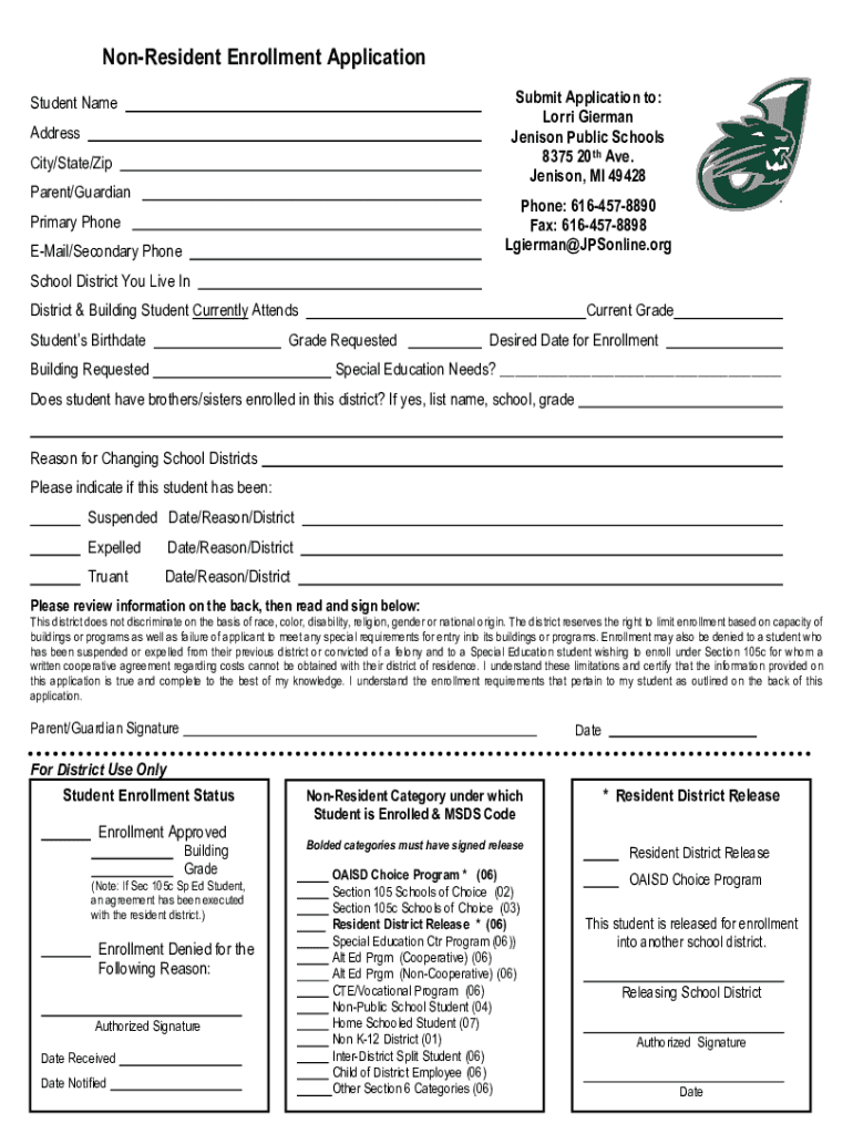 Get the free Non-Resident Enrollment Application - Jenison Public Schools