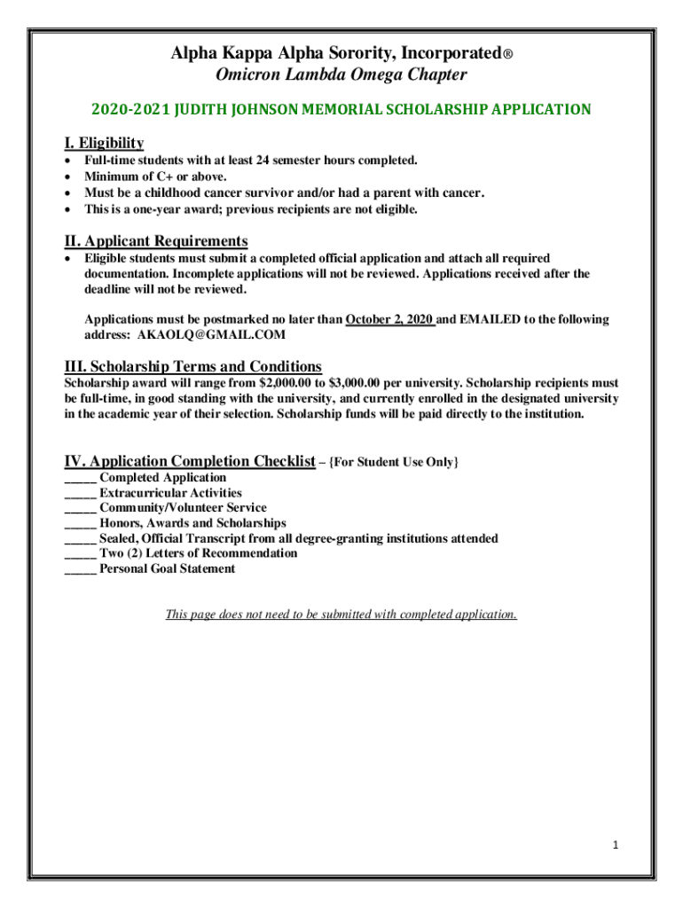 Alpha Kappa Alpha Sorority, Incorporated Omicron Lambda Omega Chapter 20202021 JUDITH JOHNSON MEMORIAL SCHOLARSHIP APPLICATION I. Eligibility Full time students with at least 24 semester hours completed.