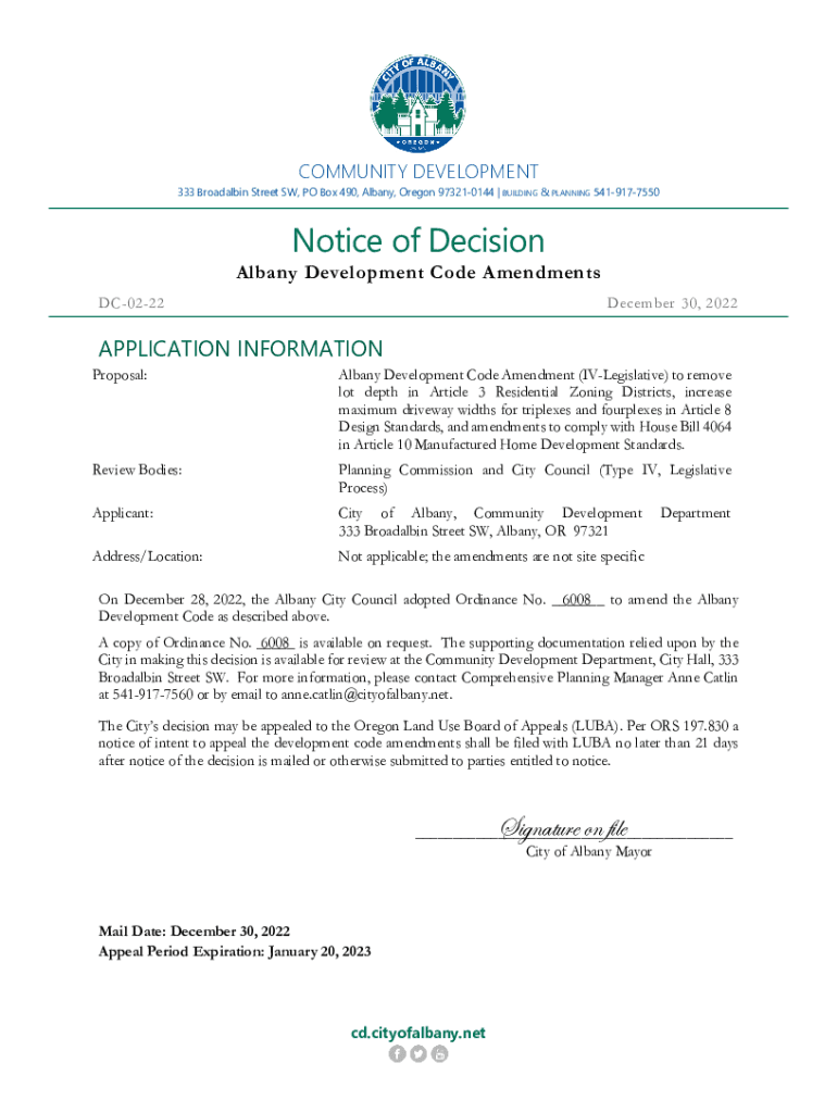 COMMUNITY DEVELOPMENT333 Broadalbin Street SW, PO Box 490, Albany, Oregon 973210144 | BUILDING & PLANNING 5419177550Notice of Decision Albany Development Code Amendments DC0222December 30, 2022APPLICATION