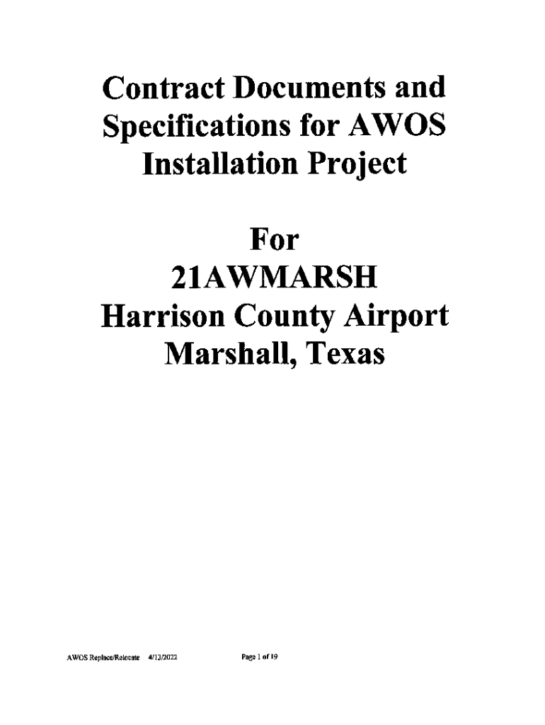 Contract Documents and Specifications for AMOS Installation Project For 21AWMARSH Harrison County Airport Marshall, TexasAWOS Replace/Relocate4/13/2022Page 1 of 19TABLE OF CONTENTS Harrison County