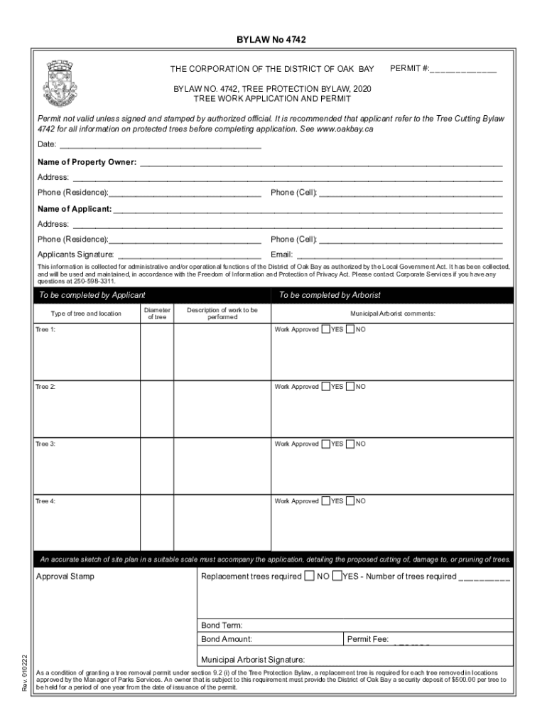 BYLAW No 4742 THE CORPORATION OF THE DISTRICT OF OAK PERMIT #:___BYLAW NO. 4742, TREE PROTECTION BYLAW, 2020 TREE WORK APPLICATION AND PERMIT not valid unless signed and stamped by authorized official.