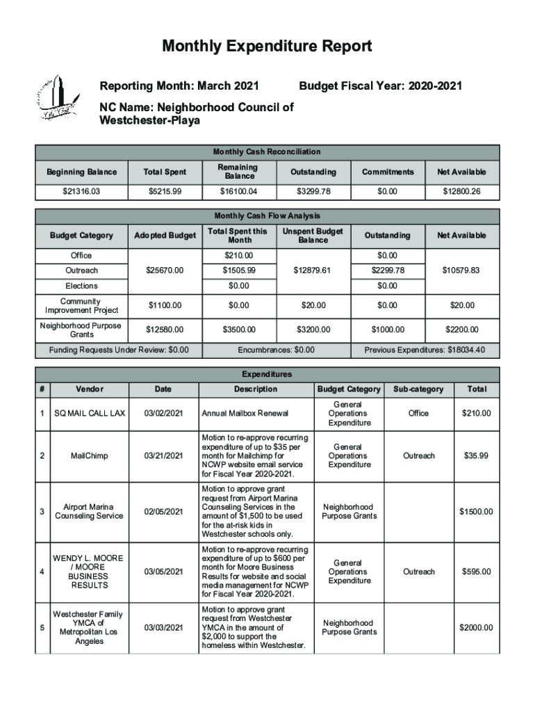 Reporting Month: March 2021Budget Fiscal Year: 20202021NC Name: Neighborhood Council of
