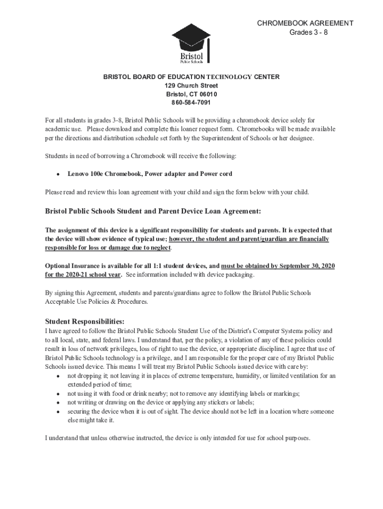 CHROMEBOOK AGREEMENT Grades 3 8BRISTOL BOARD OF EDUCATION TECHNOLOGY CENTER 129 Church Street Bristol, CT 06010 8605847091For all students in grades 38, Bristol Public Schools will be providing a