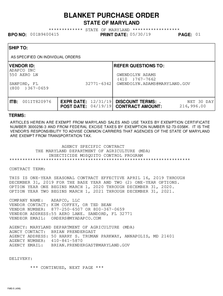 Get the free PDF version of FMIS BPO. Blanket Purchase Order number 001B9400415 - dgs maryland