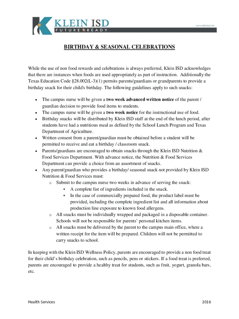 BIRTHDAY & SEASONAL CELEBRATIONSWhile the use of non-food rewards and celebrations is always preferred, Klein ISD acknowledges that there are instances when foods are used appropriately as part of