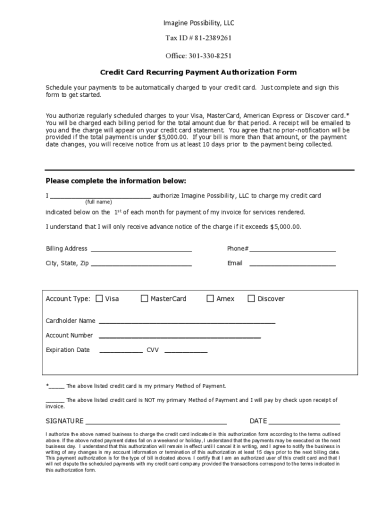 Imagine Possibility, LLC Tax ID # 812389261 Office: 3013308251 Credit Card Recurring Payment Authorization Form Schedule your payments to be automatically charged to your credit card. Just complete