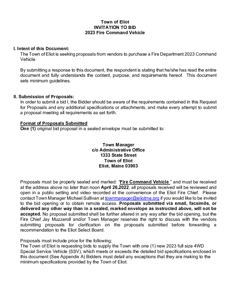 Town of Eliot INVITATION TO BID 2023 Fire Command Vehicle I. Intent of this Document: The Town of Eliot is seeking proposals from vendors to purchase a Fire Department 2023 Command Vehicle. By submitting