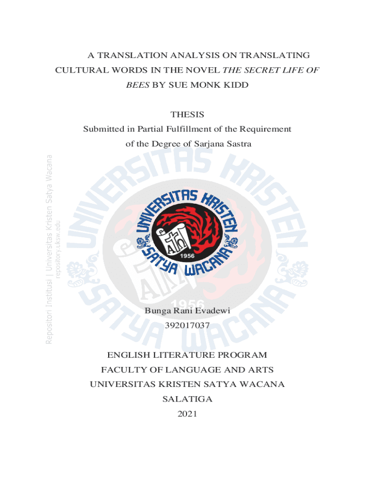 A TRANSLATION ANALYSIS ON TRANSLATING CULTURAL WORDS IN THE NOVEL THE SECRET LIFE OF BEES BY SUE MONK KIDDTHESIS Submitted in Partial Fulfillment of the Requirement of the Degree of Arjuna SastraBunga