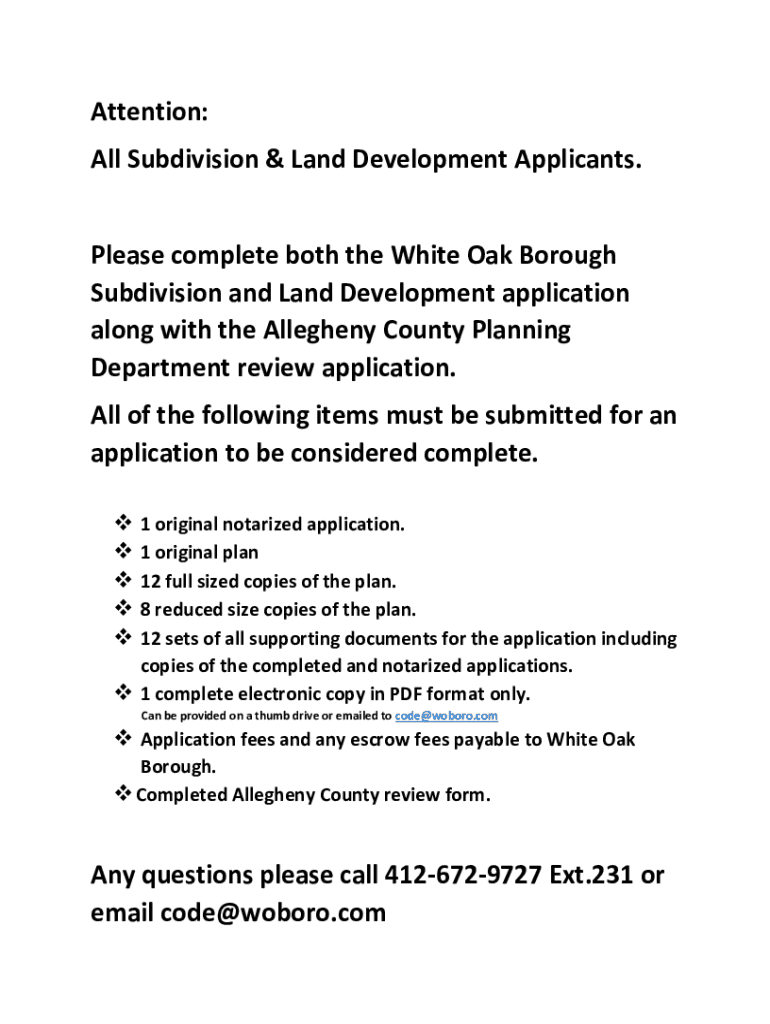 Attention: All Subdivision & Land Development Applicants. Please complete both the White Oak Borough Subdivision and Land Development application along with the Allegheny County Planning Department