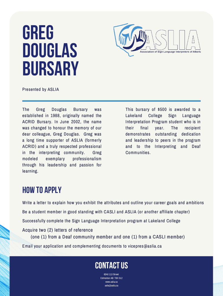 GREG DOUGLAS BURSARY Presented by Alliance Greg Douglas Bursary was established in 1988, originally named the ACRID Bursary. In June 2002, the name was changed to honor the memory of our dear colleague,