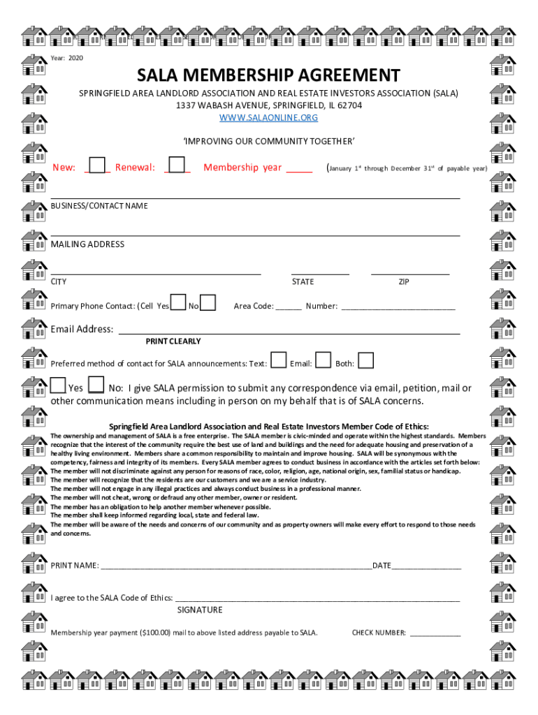 MEMBERSHIPFORMREVISED6/17SEEREVERSESIDEFORSPONSORSHIPFORM Year:2020SALAMEMBERSHIPAGREEMENT SPRINGFIELDAREALANDLORDASSOCIATIONANDREALESTATEINVESTORSASSOCIATION(SALE) 1337WABASHAVENUE,SPRINGFIELD,IL62704